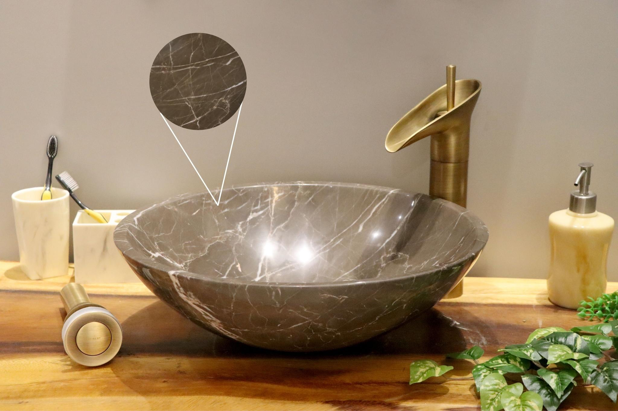 Vân, vệt và những vết rạn trong mỗi khối đá được hình thành qua kiến tạo địa chất hàng triệu năm, xưởng sản xuất cắt phôi đá theo quy cách chậu từ phiến đá nguyên khối, do đó vân vệt và vết rạn là ngẫu nhiên, tùy thuộc vị trí cắt có thể có vân, vệt chỗ đậm nhạt khác nhau, vết rạn cũng khác nhau, quý khách có thể lựa vân vệt tại kho thành phẩm có sẵn.